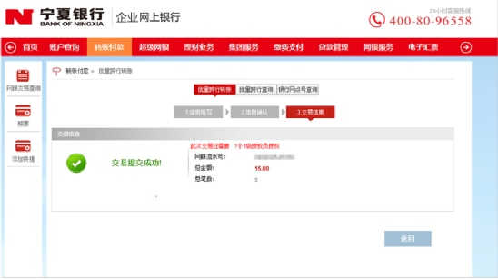 5、交易提交后,請根據(jù)結(jié)果頁面提示確認(rèn)是否需要審核;